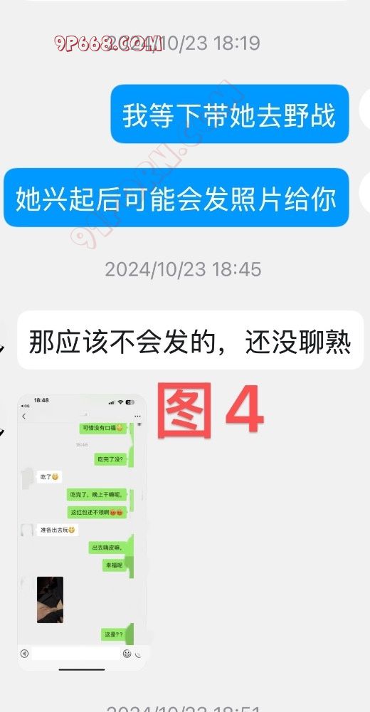 小湖北加上老婆微信后,我正愁着怎么让他们实战玩起来,恰逢来了一个千载难逢的时机。那段时间,老婆突然性欲暴涨,某天,老婆突然发微信给我问我去不去野战?我挺震惊,因为我们从来没这么玩过,更没想到居然是老婆主动提出来,这和她平时的性格完全相反。但是瞬间让我意识到这是让小湖北和老婆深入交流的绝好时机,于是我答应老婆去找地方野战,而且还鼓励她邀请找个单男加入,单男的人选就是上一次顶替我小号的那个人。并没有直接让她邀请小湖北。原因是她从未见过小湖北,直接让她约陌生人,被拒绝的概率很高。让她约其他单男没有合适人选。因为这一两个月当中她只和小号中的单男打的火热,描述起来很复杂,不知道各位能不能看懂?老婆欣然同意,为了让计划天衣无缝,当老婆在微信上问我小号要不要加入野战时,小号中的我肯定借故推脱,这样就创造了让小湖北加入的条件……(见图1、2、3)